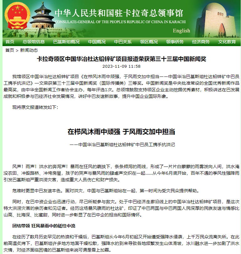 中國駐卡拉奇總領(lǐng)館網(wǎng)站刊發(fā)中國五礦所屬中國華冶作品獲獎情況