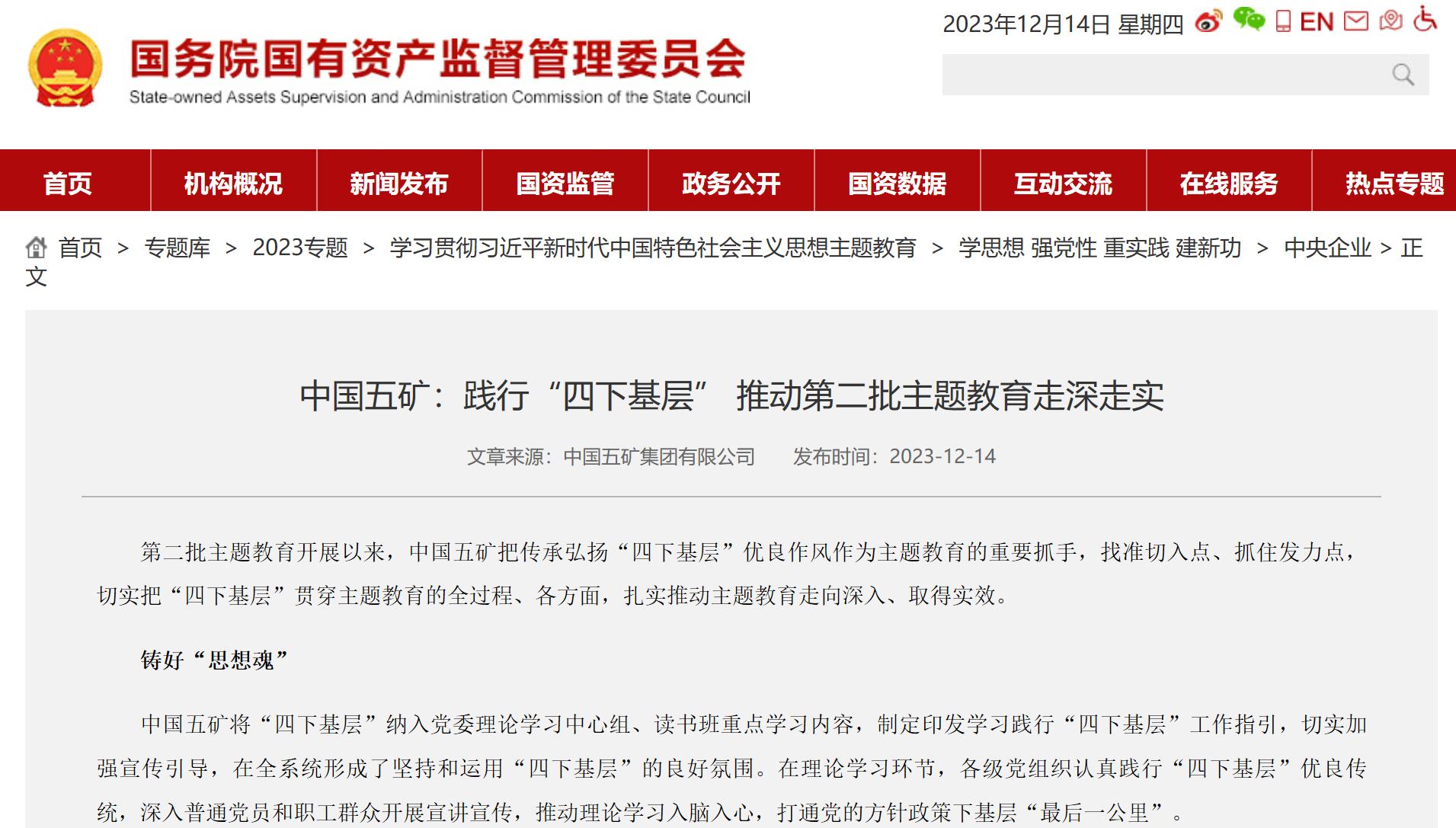 人民論壇網(wǎng)、國務院國資委網(wǎng)站、國資小新自媒體號等媒體刊發(fā)《中國五礦:踐行“四下基層” 推動第二批主題教育走深走實》一文指出,中國五礦鑄好“思想魂”,切實加強宣傳引導;答好“民生卷”,現(xiàn)場辦公、現(xiàn)場協(xié)調解決問題、現(xiàn)場接待群眾,切實把問題解決在一線、矛盾化解在一線、工作落實在一線;譜好“發(fā)展曲”,通過深入基層調查研究,改進工作作風、實現(xiàn)科學決策,為企業(yè)高質量發(fā)展筑牢根基。目前,“四下基層”已逐漸成為中國五礦黨員干部的廣泛共識和自覺行動,成為密切聯(lián)系職工群眾、走好新時代群眾路線的重要法寶。