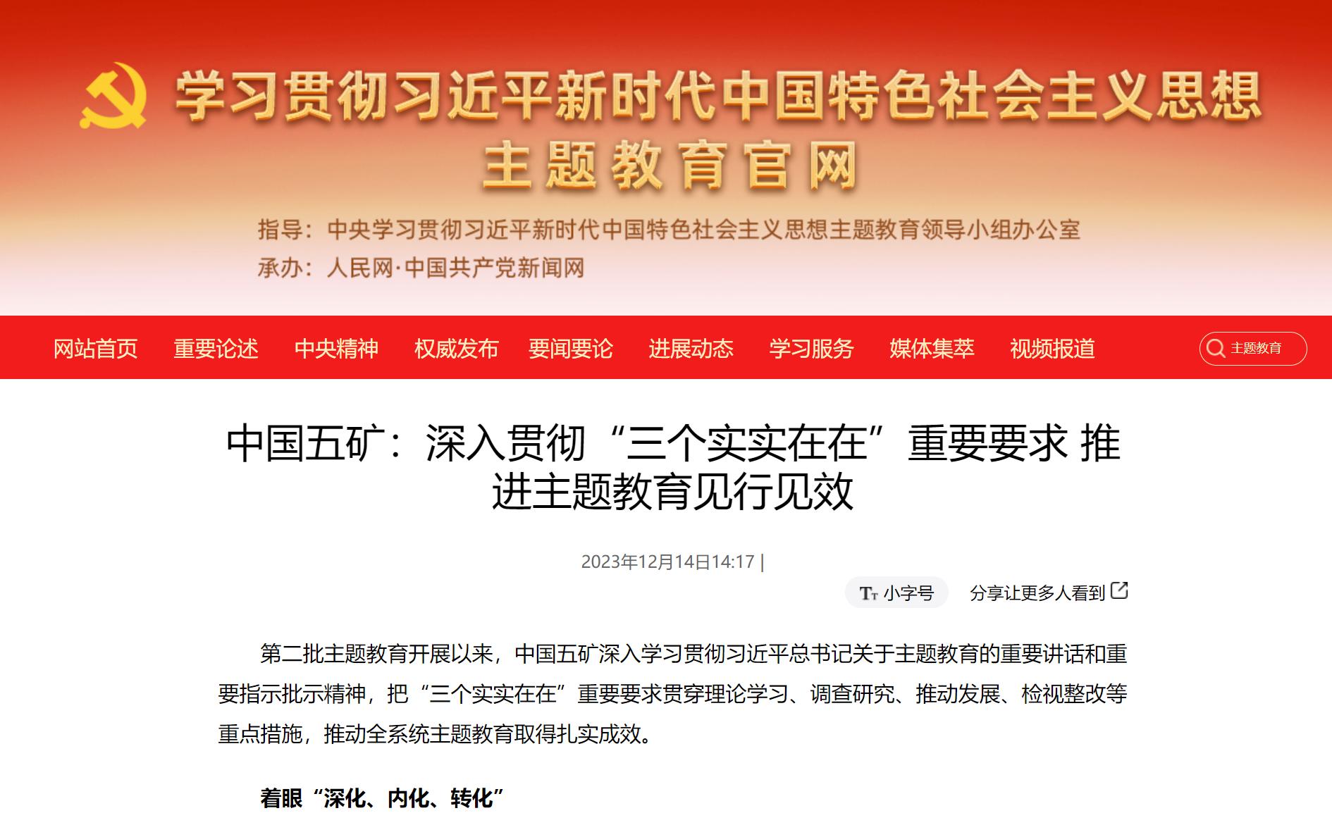 中央主題教育官網(wǎng)、學習強國刊發(fā)《中國五礦:深入貫徹“三個實實在在”重要要求 推進主題教育見行見效》一文指出,中國五礦把總書記提出的“三個實實在在”要求與自身工作實際緊密結合,著眼“深化、內化、轉化”,實實在在抓好理論學習和調查研究,堅持“上下聯(lián)動、前后銜接、當下改與長久立相結合”,實實在在檢視整改突出問題,聚焦“發(fā)展所需、改革所急、基層所盼”,實實在在辦好惠民利民實事,推動全系統(tǒng)主題教育取得扎實成效。